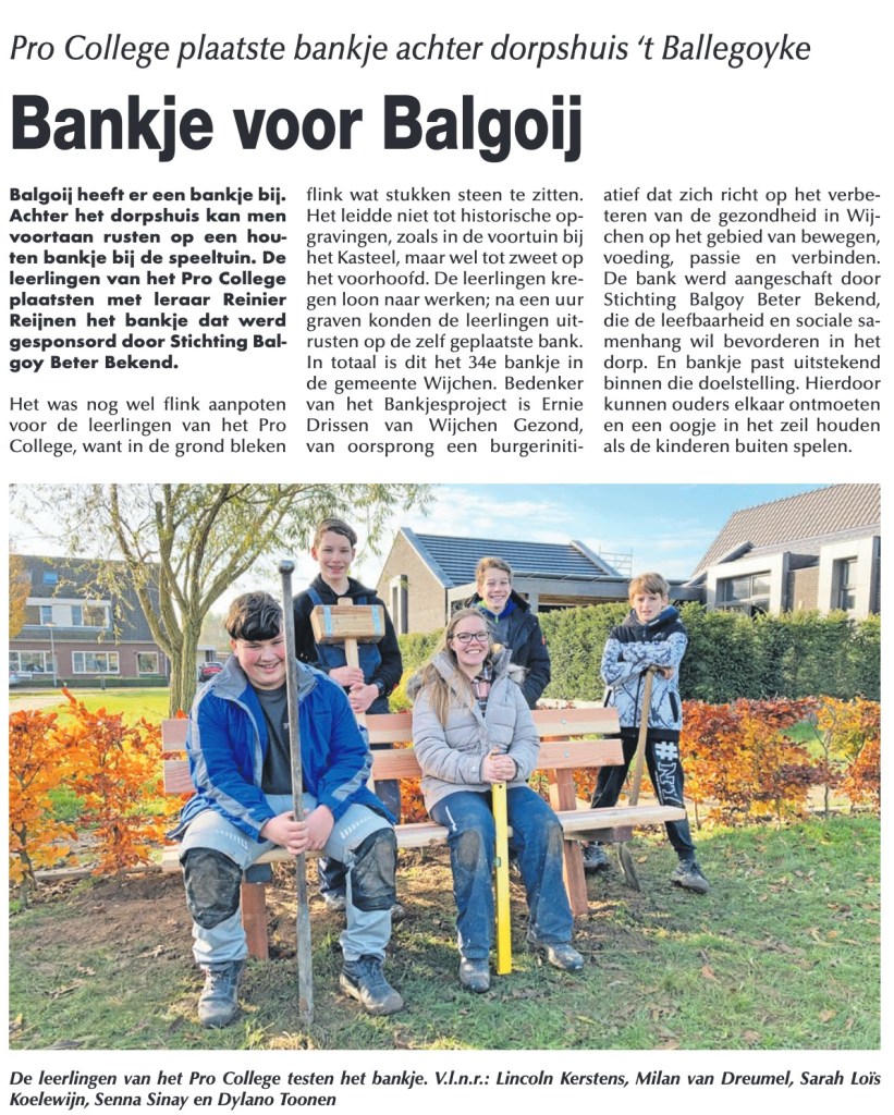 Stichting Balgoy Beter Bekend vond het een prachtig initiatief, dat de leefbaarheid en sociale samenhang in het dorp bevordert. Zoals in onderstaand artikel uit de Wegwijs van 24 november mooi wordt verwoord: “Hierdoor kunnen ouders elkaar ontmoeten en een oogje in het zeil houden als de kinderen buiten spelen”. Bovendien kunnen jong en oud verhalen uit en over het dorp met elkaar delen.