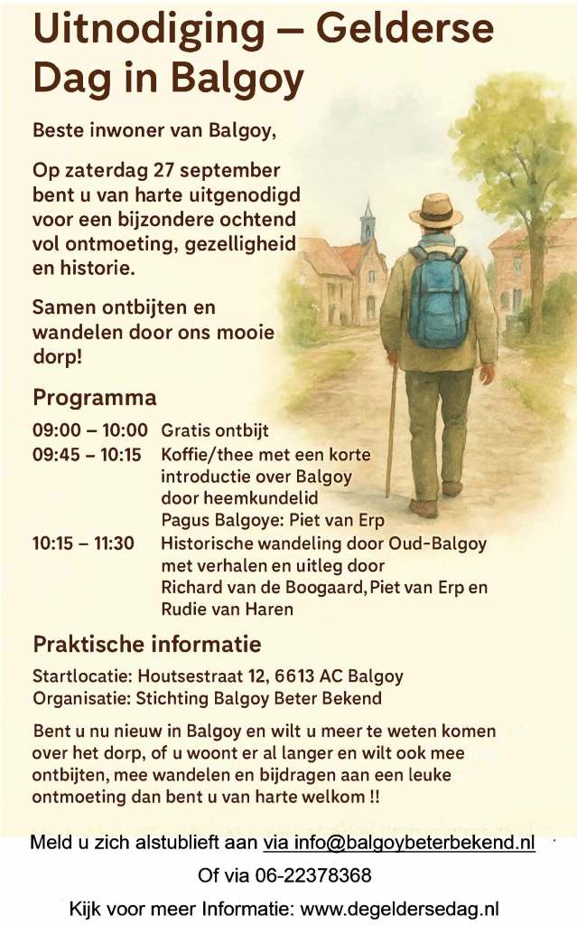 Wat: kennismaken met Balgoy en contact met Balgoyse mensen onder het genot van koffie-thee – kopje Soep. Korte introductie over de geschiedenis van het dorp door Piet van Erp.